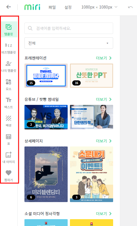 그리고 위에 '검색어를 입력하세요' 에 원하는 키워드를 넣으면 유사한 템플릿 검색도 가능합니다.