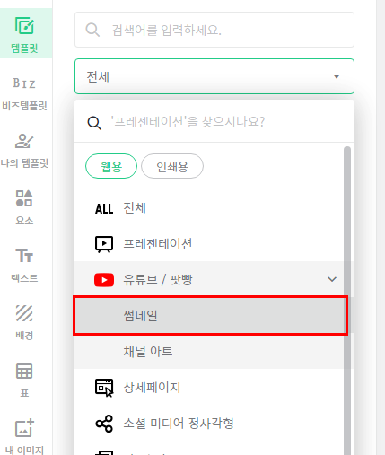 그리고 그 중에 썸네일 만들꺼니까 썸네일을 클릭합니다.